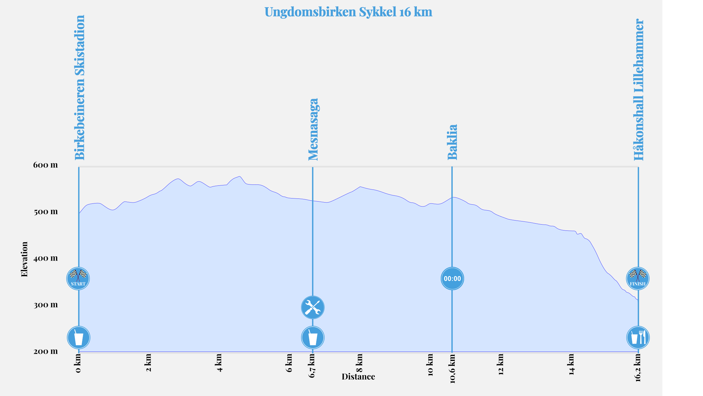 The course enters Birkebeineren Ski Stadium and continues on gravel roads to Kroken, followed by a steep paved descent with sharp turns leading to the top of Ballettbakken. Here you face a long and steep gravel descent before the route circles around the ski jumps and takes the trail down Gamle Nordseterveg to the finish line at Håkons Hall (290 m.a.s.l.).