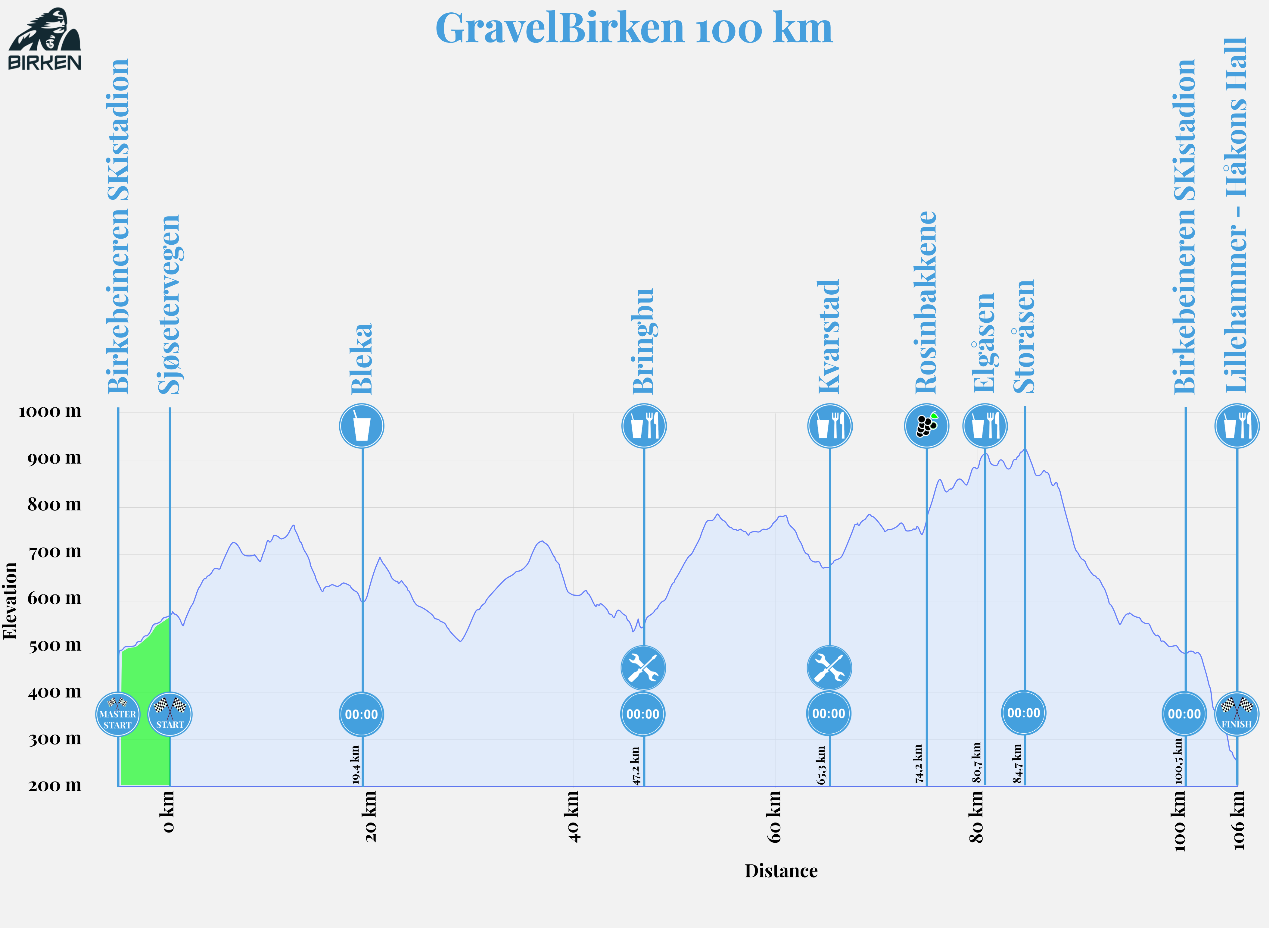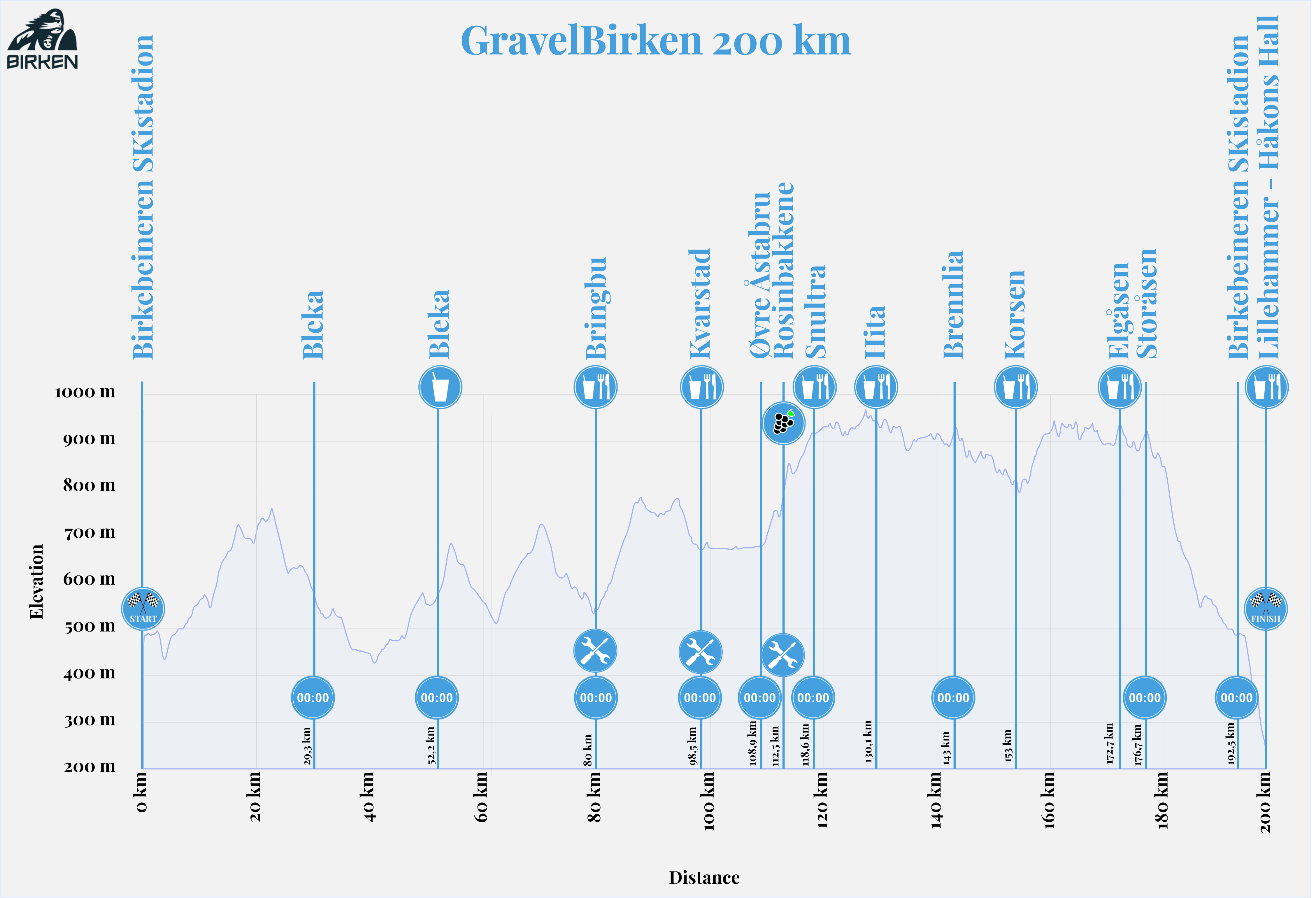 Refill of water and Maxim sports drink at the start, drink station at Bleka, and food/drinks at Bringbu, Kvarstadsætra and Elgåsen – as well as at the finish by Håkons Hall.GravelBirken 200